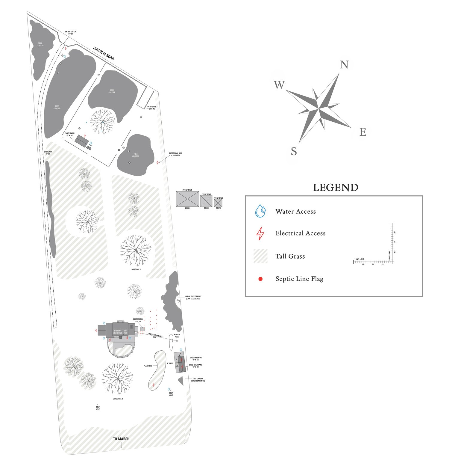 This page gives you a simple overview of how Pine Creek Place is laid out. The diagram below shows the main house, lawn, oak trees, barn, and surrounding grounds so you can see how the property fits together. It’s useful for anyone picturing how an event might use the space, and it’s the same layout planners and vendors reference when working out logistics.